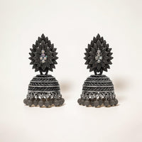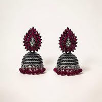 A floral Jhumka with delicate pearl trim — in warm magenta or muted grey. Handcrafted in South India, nickel-free and pleasantly light to wear. Sets a soft accent against a festive dress and works just as well over a simple shirt in daily life.